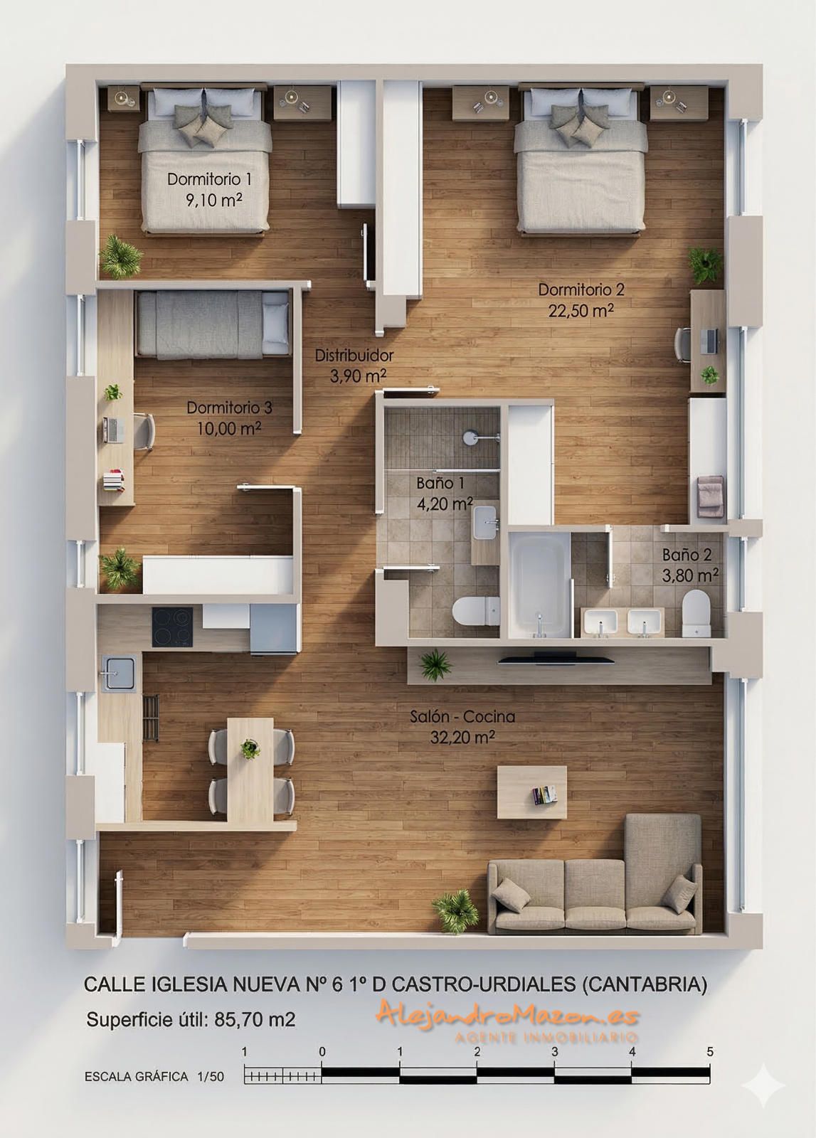 El proyecto está diseñado para que disfrutes de una vivienda moderna y espaciosa con vestíbulo, cocina, un gran salón-comedor, 3 amplios dormitorios y 2 baños completos.