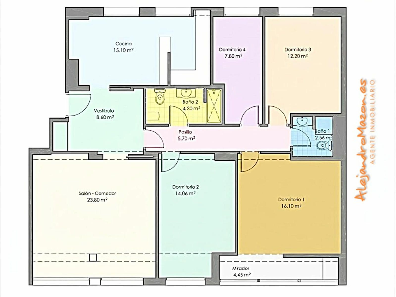 .El piso ofrece 4 habitaciones, ideales tanto para familias numerosas como para quienes necesitan despacho o zona de juegos, y 2 baños con ducha situados en el pasillo.